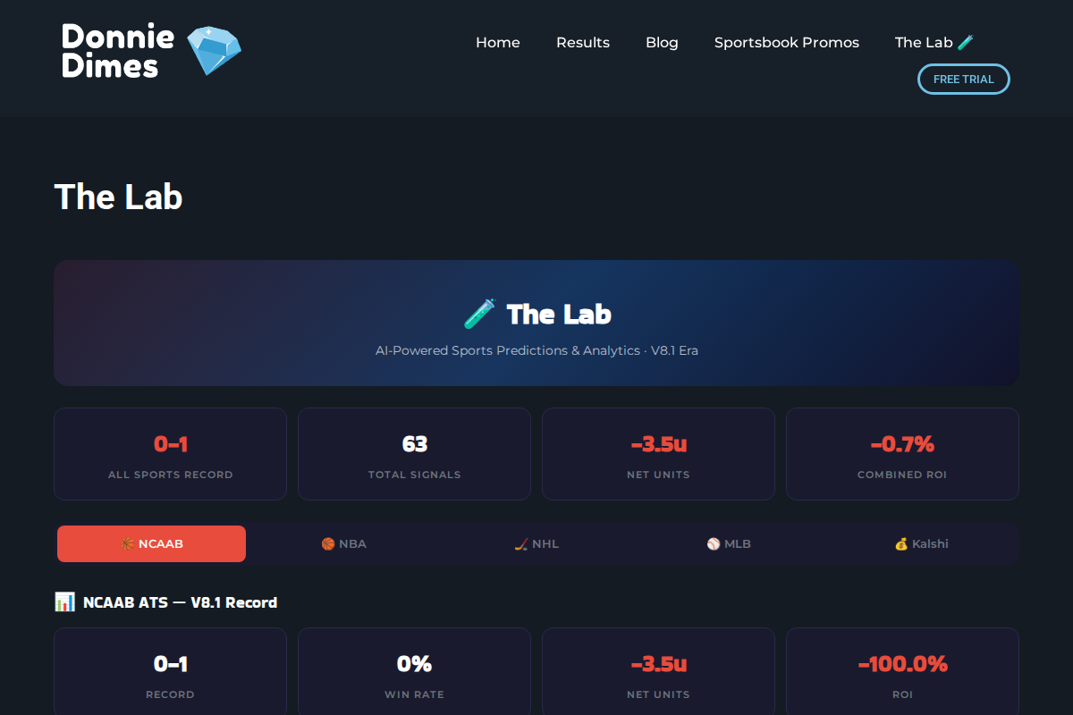 The Lab V8.1 combines structural edge filters with projected margin modeling across NCAAB, NBA, and more. Every pick is backtested, graded, and tracked with full transparency.